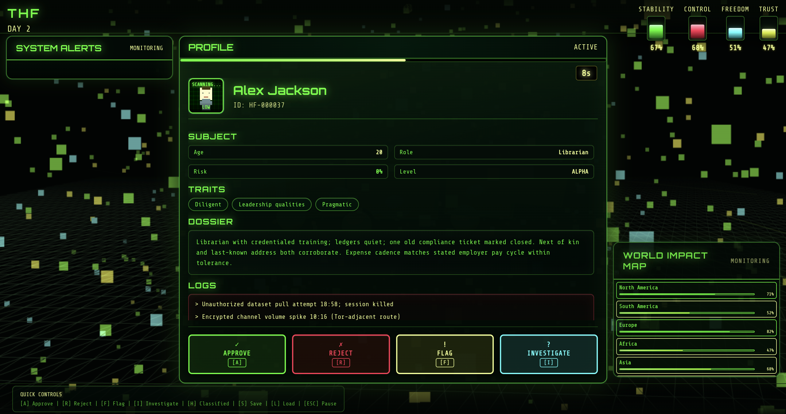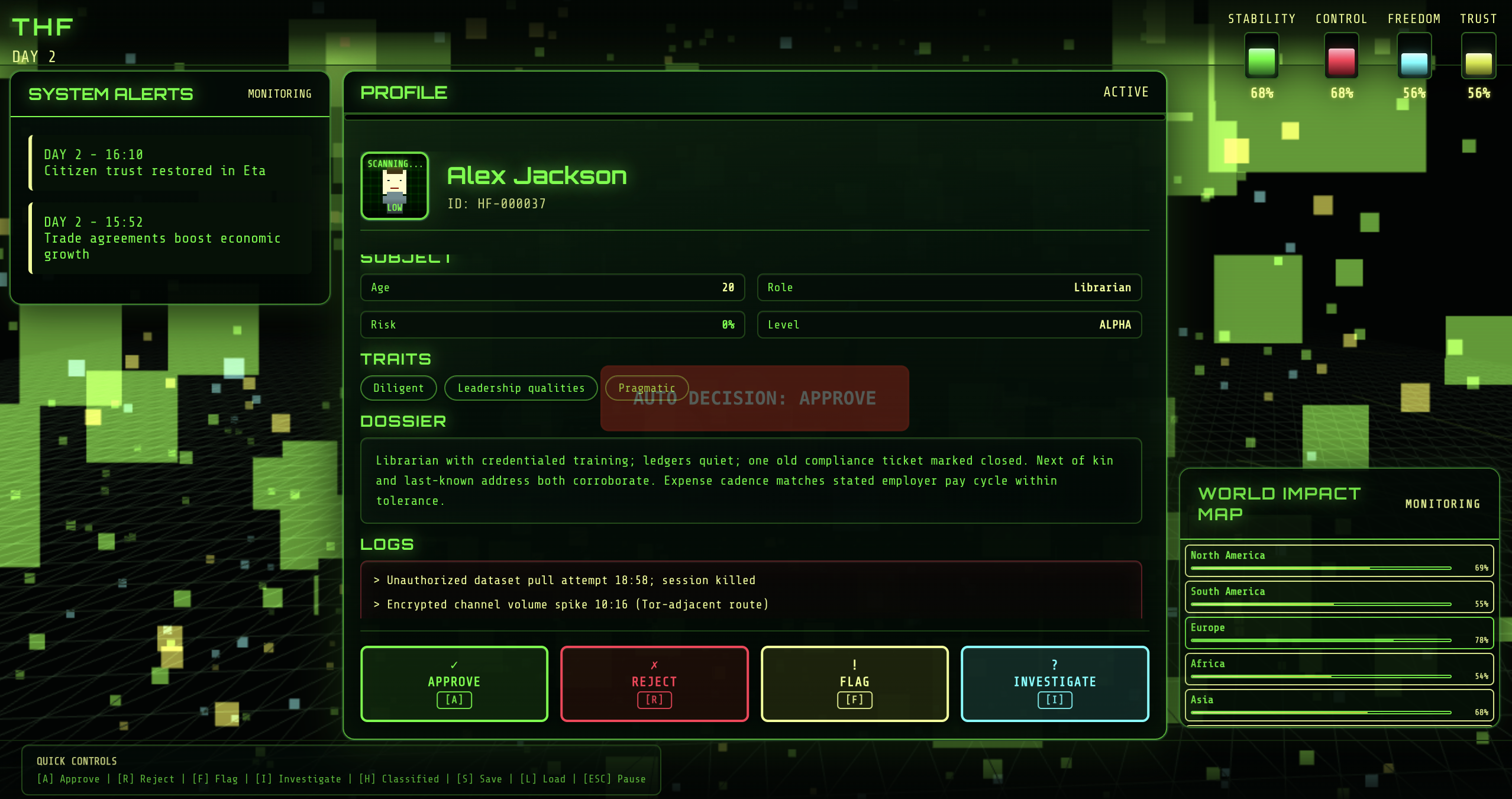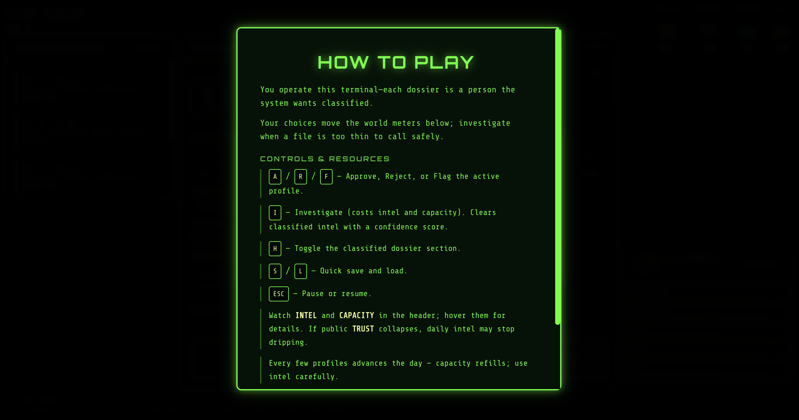 In a dystopian future, a stream of human profiles arrives at your interface. Every decision you make — approve, reject, or flag — reshapes the world: stability, control, freedom, and trust.